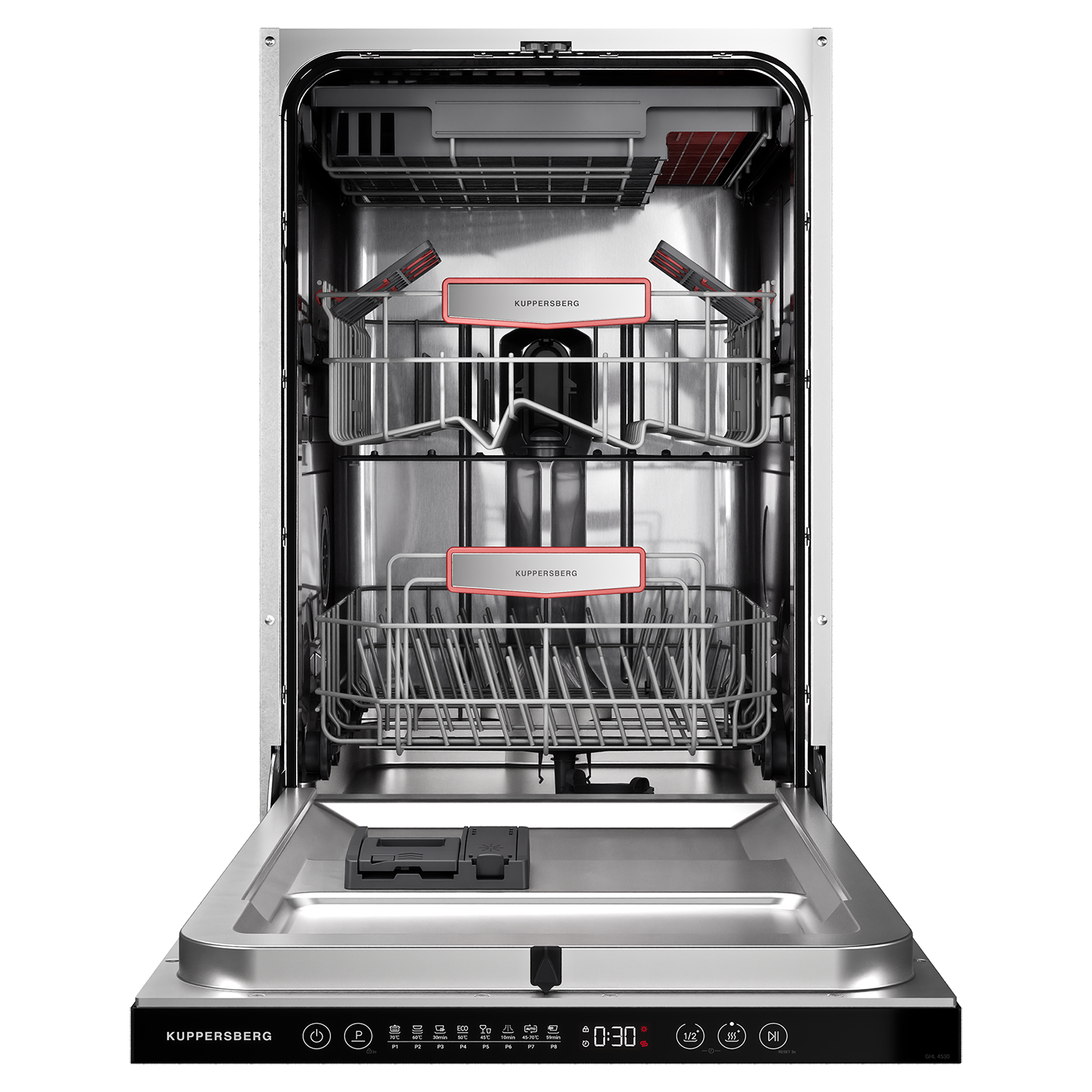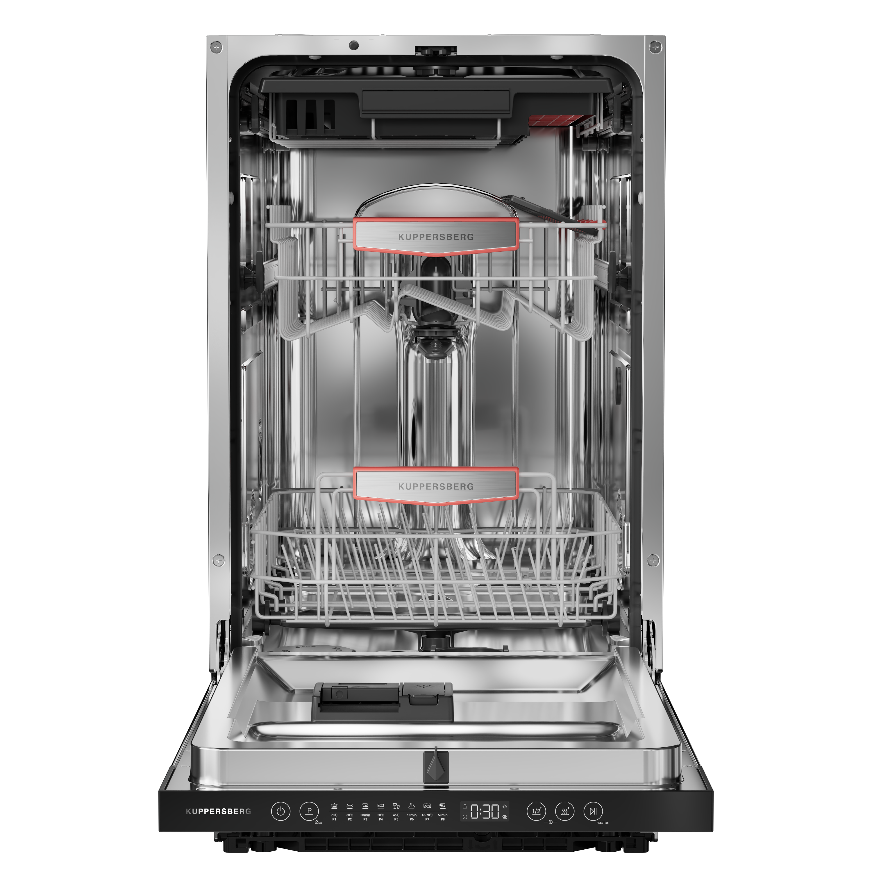 Тройная система корзин обеспечивает оптимальную организацию посуды для эффективной мойки.