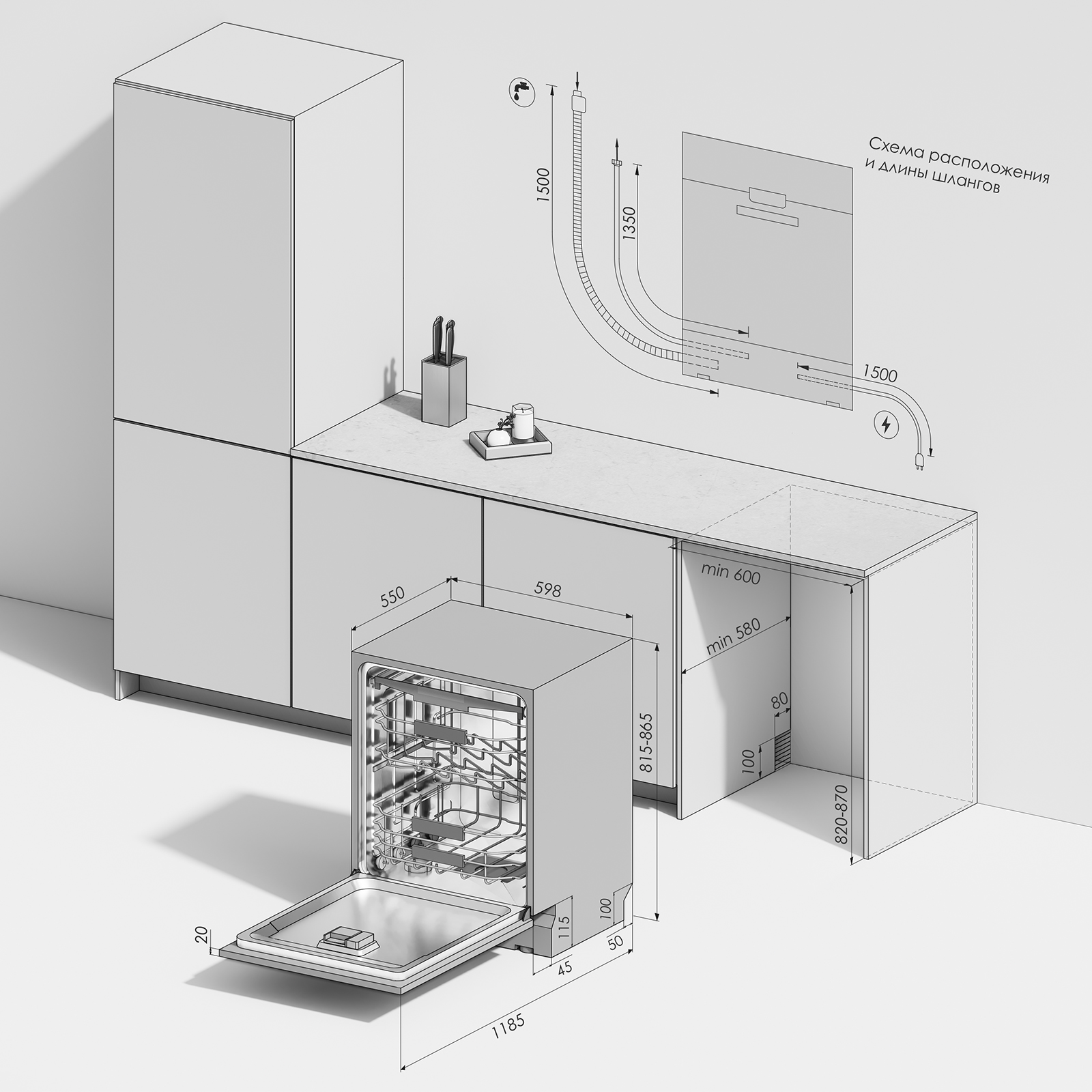 - Размер ниши для встраивания (ВхШхГ), мм 820х600х580