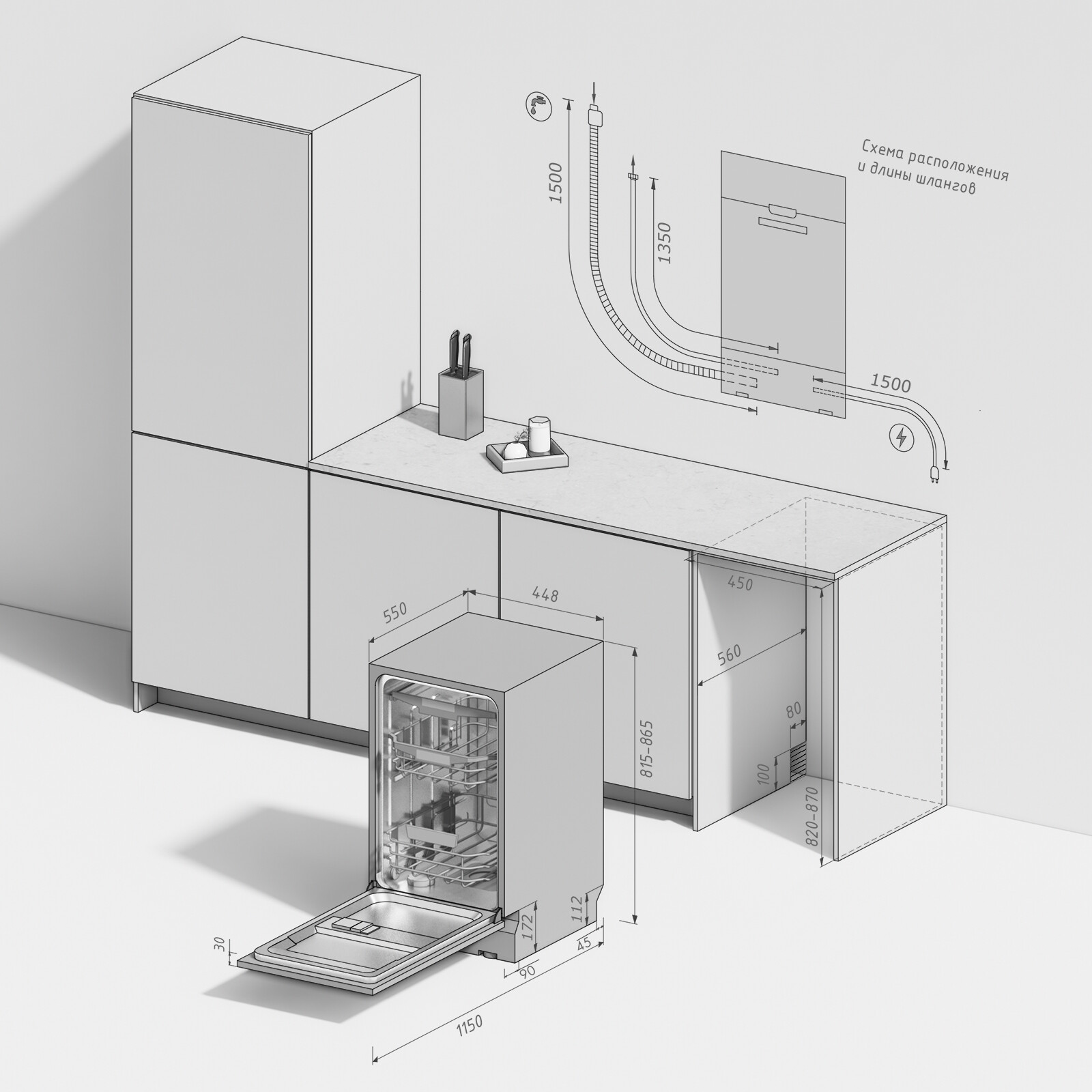 - Размер ниши для встраивания (ВхШхГ), мм 820х450х580