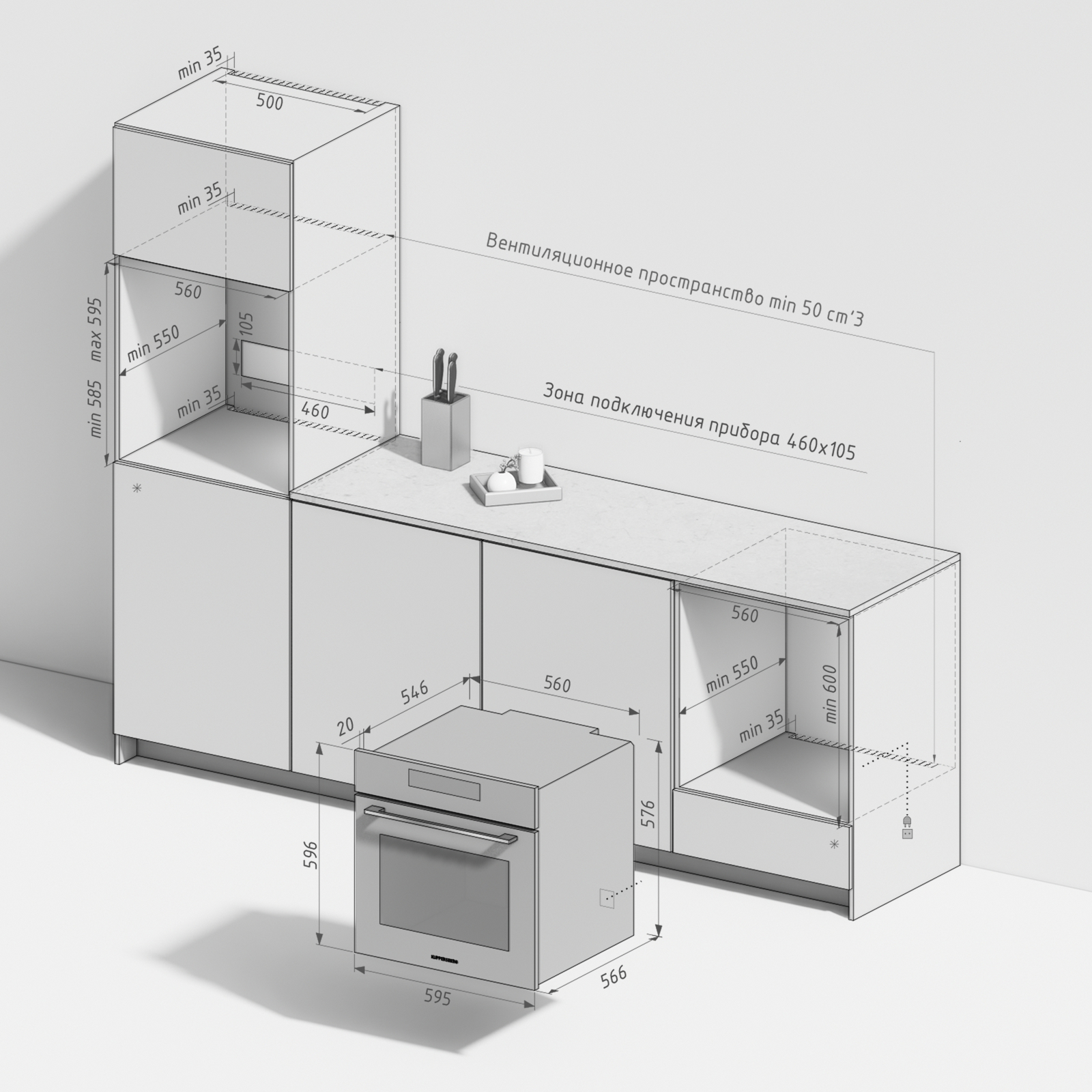 - Размер ниши для встраивания (ВхШхГ), мм 600х560х550