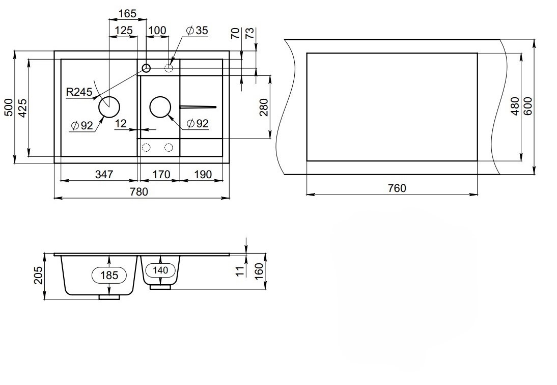 - Комплектация Отводная арматура с сифоном и корзинчатым вентилем